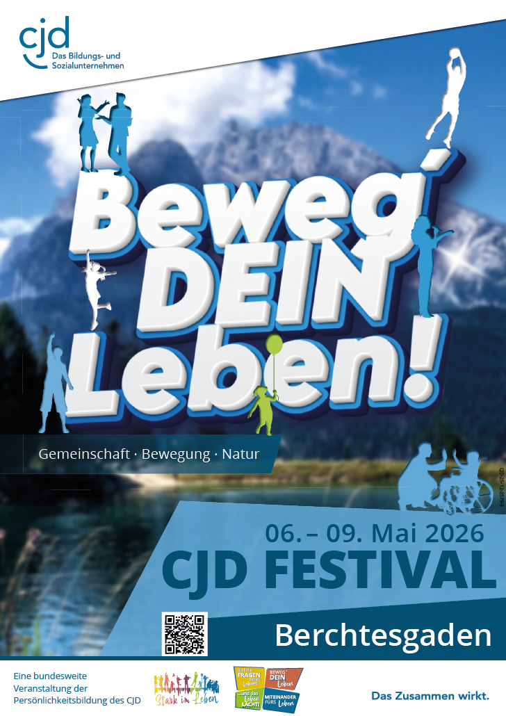 Das CJD Festival "Beweg' dein Leben" findet vom 06. bis 09. Mai 2026 in Berchtesgaden statt.Im Mittelpunkt des Festivals steht die Bewegung im Alltag, in der Natur und das Erleben der Natur. Besonderes Highlite ist die Wahrnehmung einer großen Gemeinschaft die stark macht. Wo könnte man dieses Thema besser und charmanter (vielleicht auch extremer ;)) erleben, als im wunderschönen und beeindruckenden Panorama der Berchtesgadener Bergwelt?
