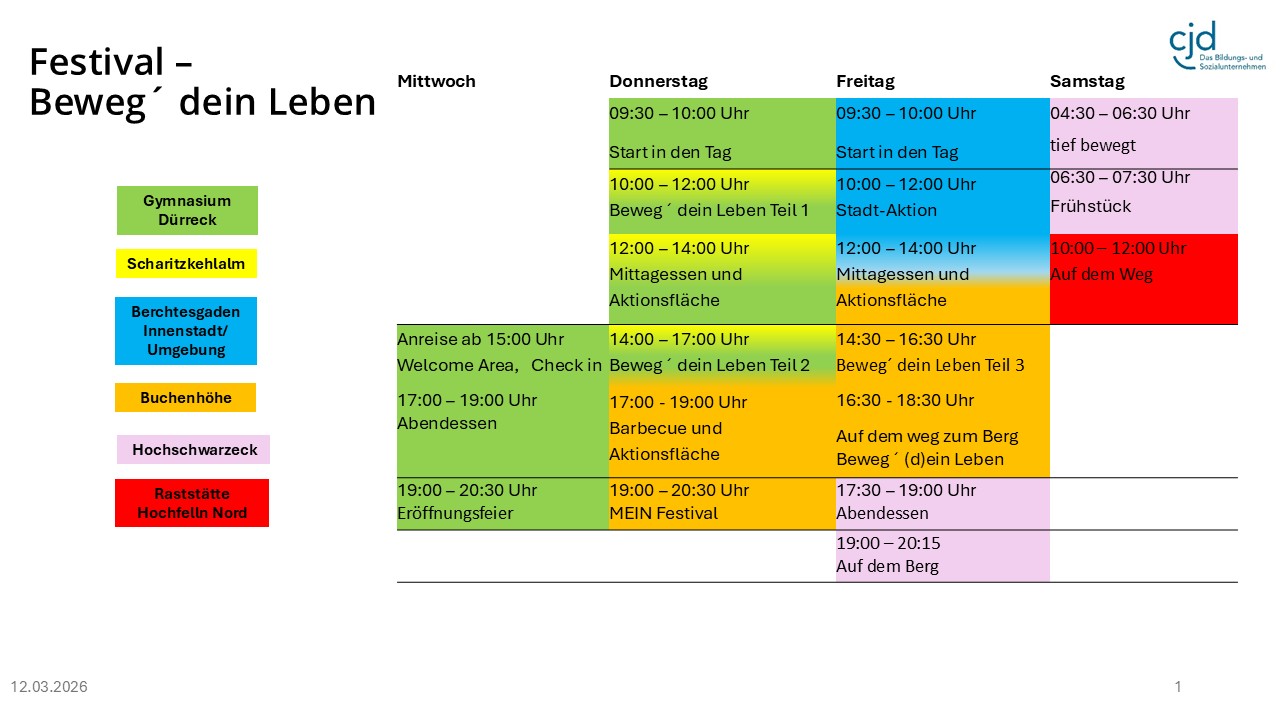 Das CJD Festival "Beweg' dein Leben" findet vom 06. bis 09. Mai 2026 in Berchtesgaden statt.Im Mittelpunkt des Festivals steht die Bewegung im Alltag, in der Natur und das Erleben der Natur. Besonderes Highlite ist die Wahrnehmung einer großen Gemeinschaft die stark macht. Wo könnte man dieses Thema besser und charmanter (vielleicht auch extremer ;)) erleben, als im wunderschönen und beeindruckenden Panorama der Berchtesgadener Bergwelt?